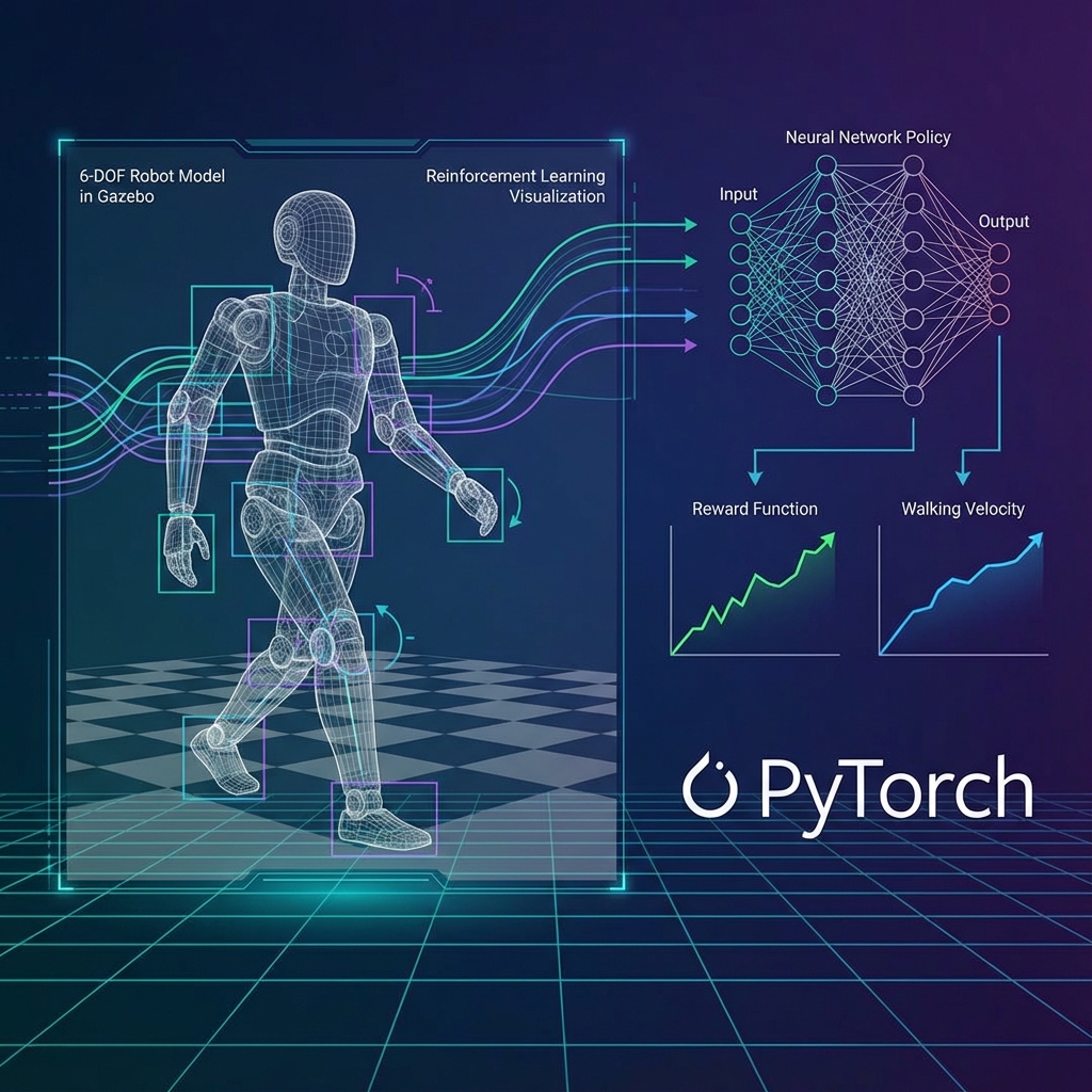 Complete reinforcement learning framework for training a bipedal robot to walk using ROS 2, Gazebo, and PyTorch PPO. Features custom 6-DOF robot simulation and advanced reward engineering.