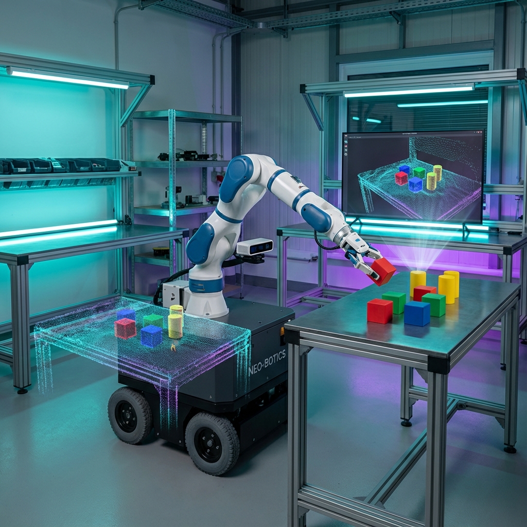 Autonomous mobile manipulator combining differential drive base with robotic arm, trained using RL for pick-and-place operations. Integrates RGB-D perception and continuous action space control.